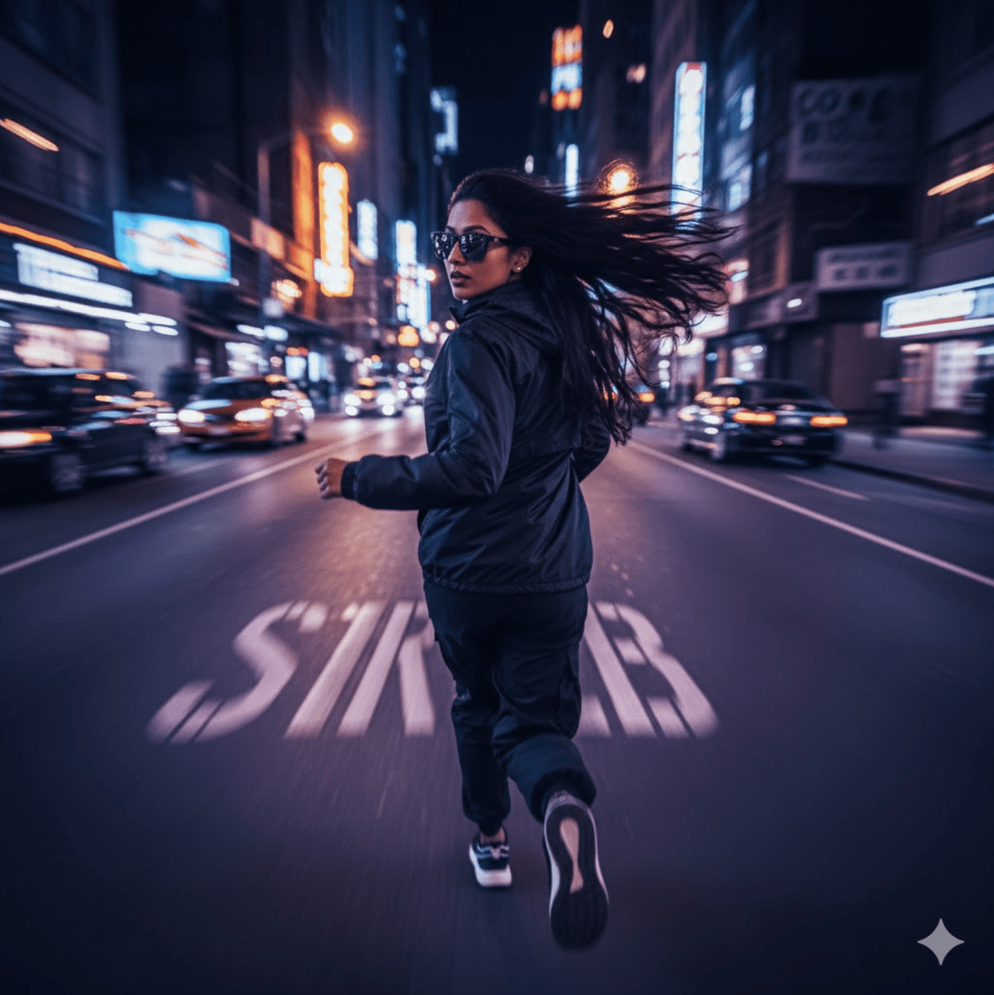 A kinetic street fashion image of a South Asian woman in her late 20s, captured from behind and slightly above as she runs away through the frame, looking back over her shoulder with intensity, her windbreaker and hair streaming backward, bokeh creating depth tunnels. She sports reflective sunglasses visible in the glance-back and technical pants. The urban nightscape rushes into vanishing point. Pursuit angle photography, cinematic depth compression, speed tunnel effect, razor-sharp backward glance