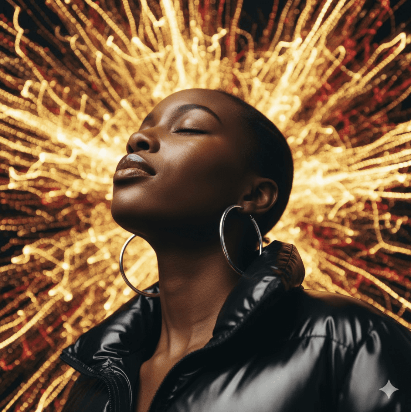 A high-fashion detail shot of a Black woman in her early 20s, captured from below in extreme close-up as she spins, showing only her face, neck and shoulders rotating, her hoop earrings catching light, bokeh exploding in tight proximity around her skin. She has closed eyes in pure moment and wears a cropped puffer jacket just visible. The background compresses into abstract light bursts. Intimate low-angle macro, rotational blur at edges, warm skin-tone emphasis, hyper-detailed facial capture