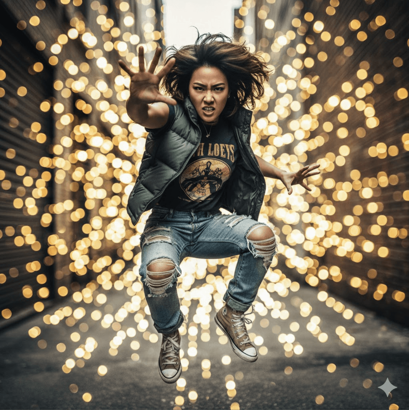 A street style editorial of an Asian woman in her late 20s, shot at eye level as she jumps directly toward the camera with explosive energy, her puffer vest floating and arms reaching forward, bokeh circles expanding outward like an impact. She has a fierce, determined expression and wears ripped jeans. The gritty alley compresses into layered light orbs. Head-on collision photography, compressed depth, aggressive urban aesthetic, tack-sharp mid-air freeze