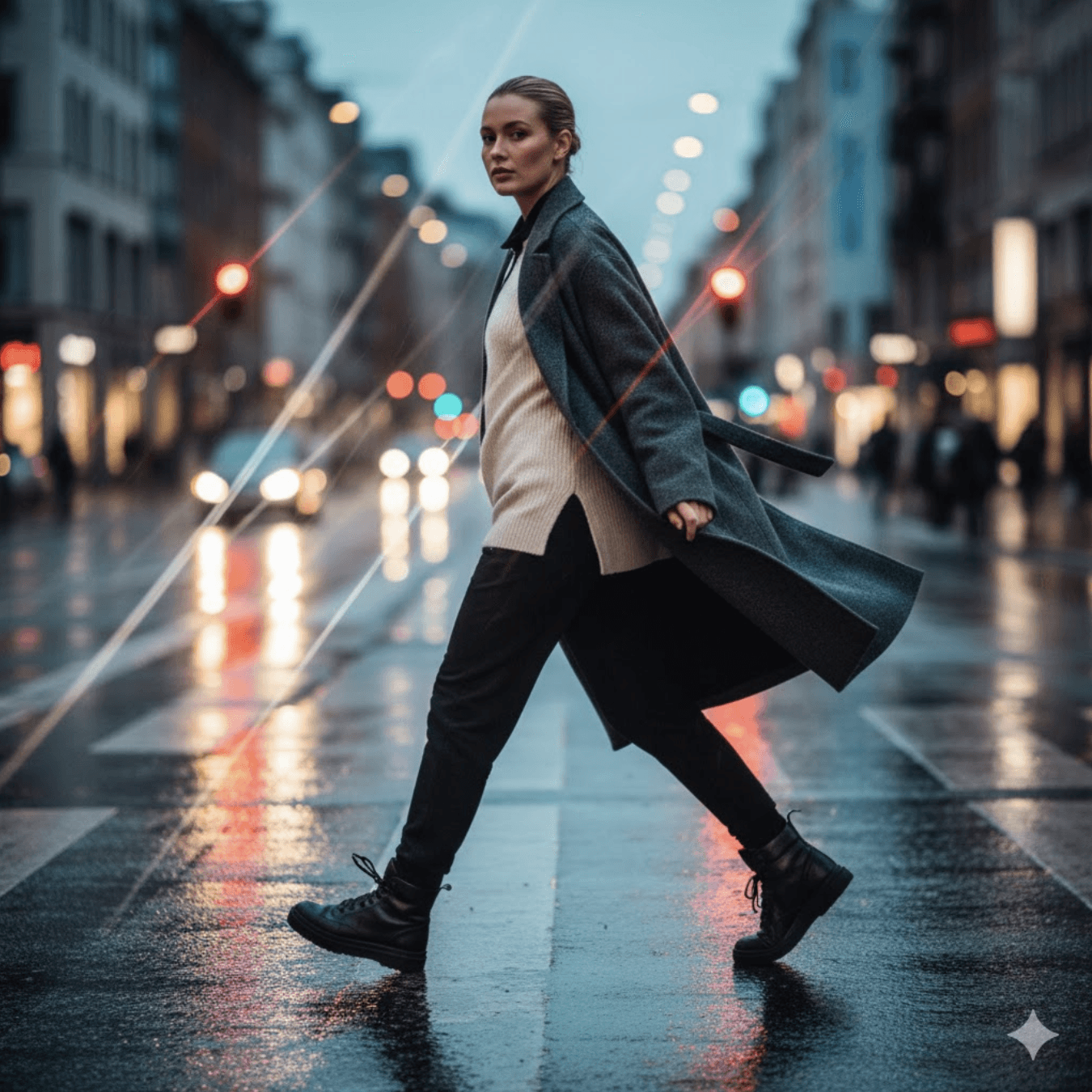 A contemporary fashion editorial of a Nordic woman in her mid-20s, shot from a three-quarter angle as she walks diagonally across the frame with purposeful stride, her oversized wool coat swinging open, bokeh lights creating diagonal light rays that mirror her path. She has a sideways glance toward camera and wears layered streetwear. The rainy urban street reflects colored lights. Classic editorial angle, dynamic diagonal composition, atmospheric moisture, selective three-quarter focus