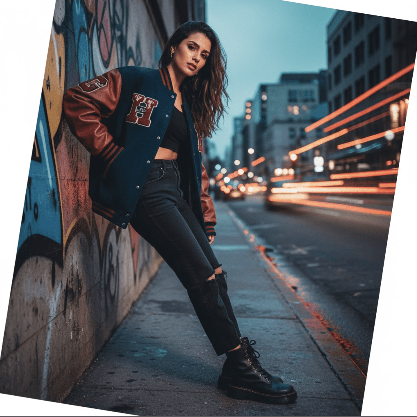 A contemporary fashion spread featuring a Middle Eastern woman in her mid-20s, captured with a tilted 45-degree angle as she leans into the frame against graffiti, creating diagonal tension, soft bokeh from traffic streaking diagonally across the composition. She exudes rebellious cool and wears an oversized varsity jacket with combat boots. The twilight urban backdrop slants dynamically. Canted angle street photography, off-kilter energy, moody diagonal color grading, sharp angular focus